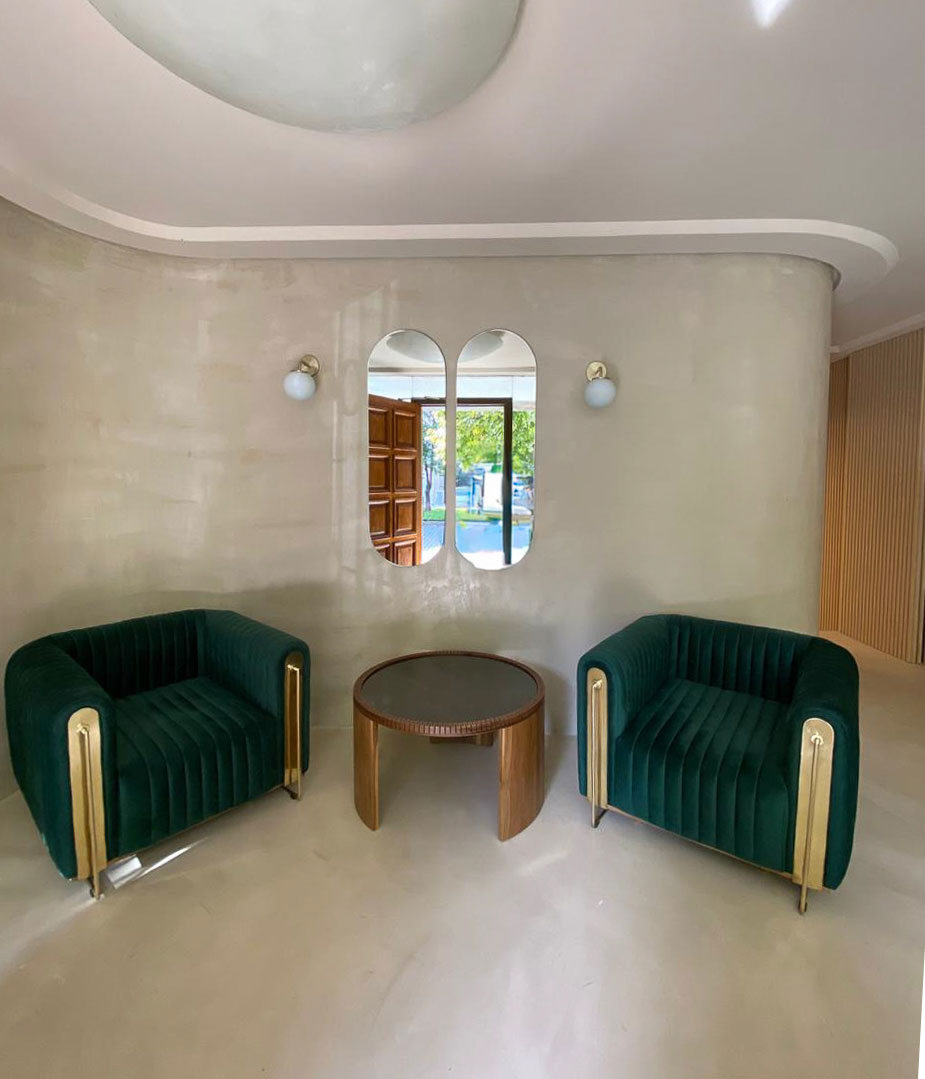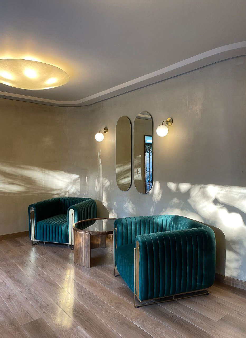Los sillones individuales tapizados en terciopelo, diseñados especialmente para este espacio, con detalles bañados en bronce acompañan la estética sobria y elegante en conjunto con nuestra mesa ratona victoria.
