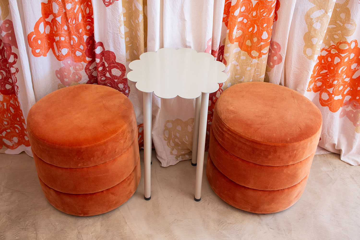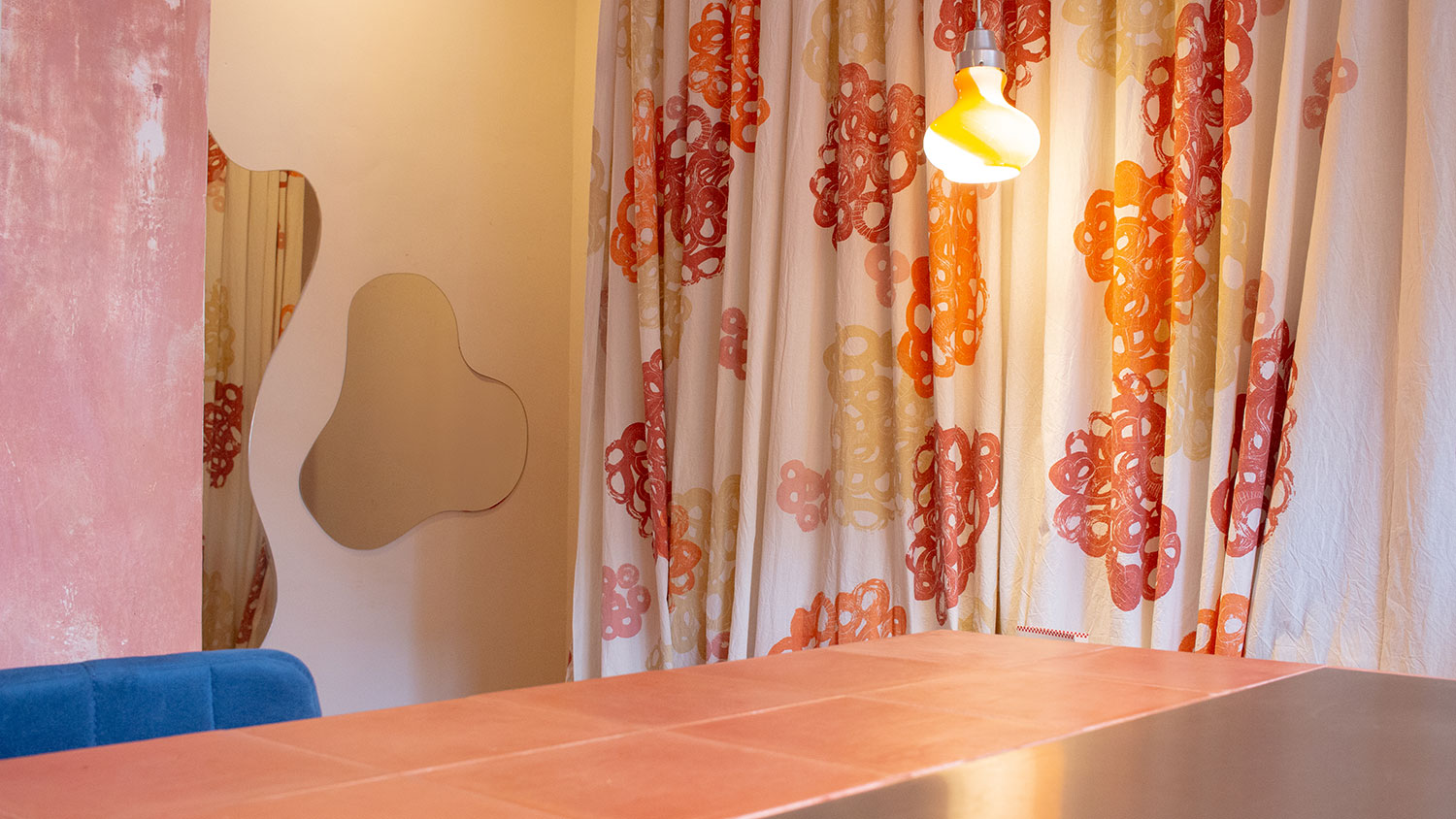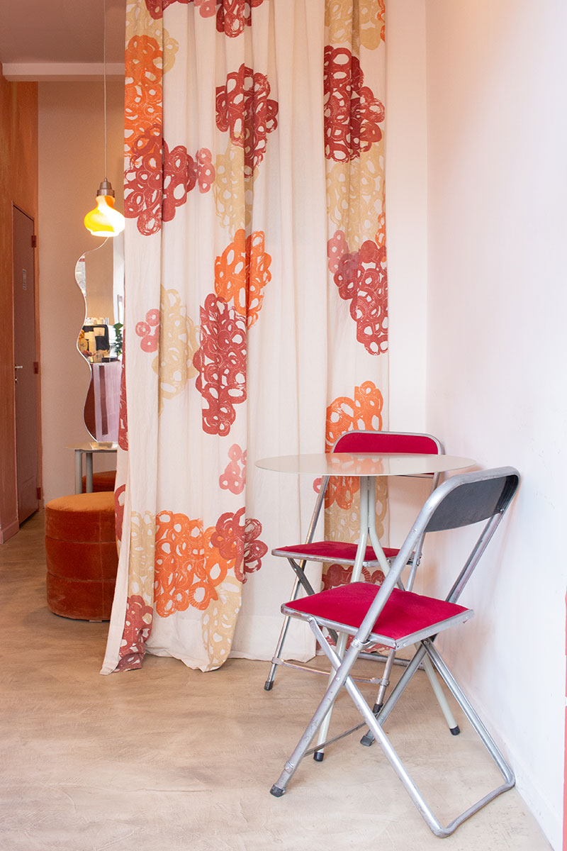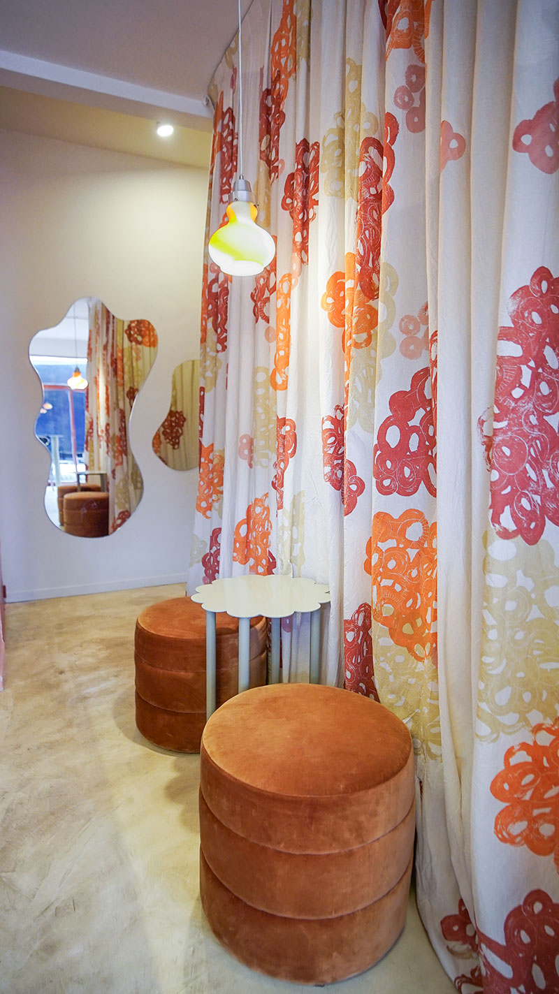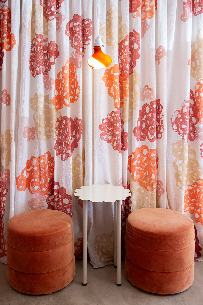 En las paredes realizamos una textura artesanal, a partir de la técnica de estucado, aportando identidad al espacio. En contraposición, un cortinado resuelve la división del espacio público con el depósito, dándole textura y calidez a lo que simularía ser una pared.